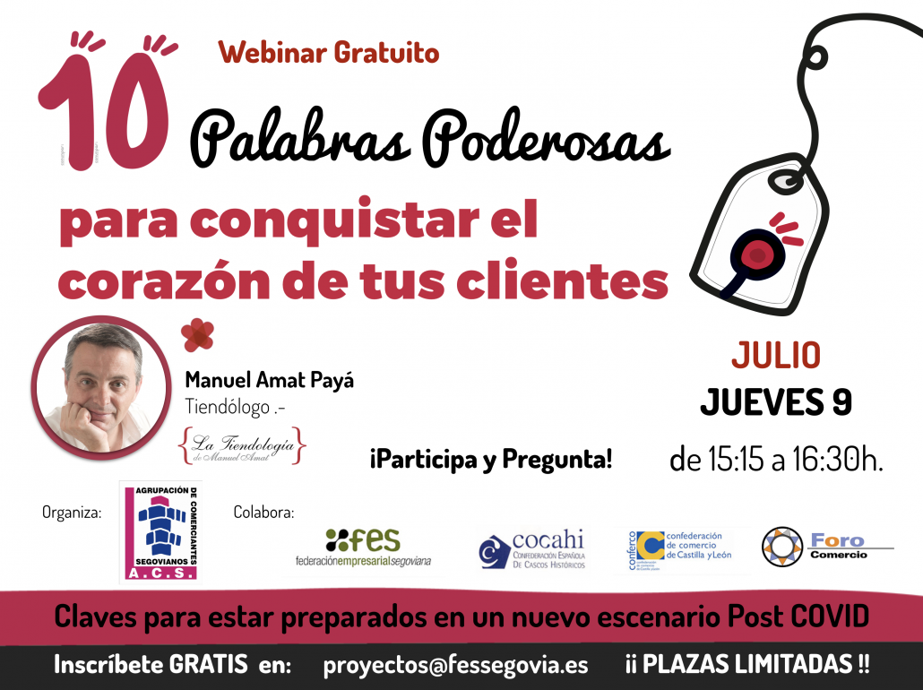 El próximo jueves 9 de julio de 15,15 a 16,30 horas y formato telemático ( on line Zoom ) vamos a celebrar un webinar que tendrá por título: “10 palabras poderosas para conquistar el corazón de tus clientes».
