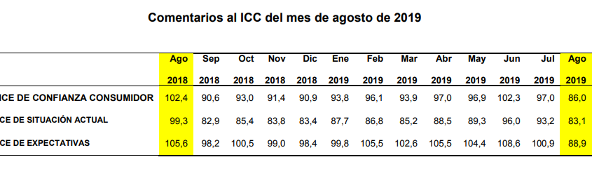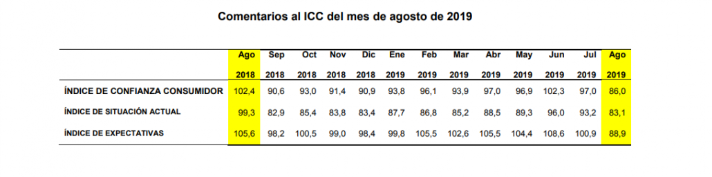 El Indicador mensual de Confianza del Consumidor (ICC) del mes de agosto publicado por el Centro de Investigaciones Sociológicas se sitúa en 86,0 puntos, 11 puntos por debajo del dato del mes anterior. Este importante descenso del índice se debe a una evolución negativa de sus dos componentes: el índice de situación actual baja en 10,1 puntos, y en la valoración de las expectativas se observa un descenso mayor, -11,9 puntos. De esta forma, el ICC vuelve a situarse en valores similares a los registrados en el segundo semestre del año 2014.