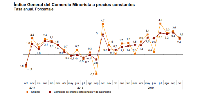 El Índice de Comercio al por Menor (ICM), la serie original del ICM a precios constantes registró en octubre una variación interanual de las ventas del 2,4% respecto a octubre de 2018, lo que supone ocho décimas por debajo de la tasa del mes anterior.
