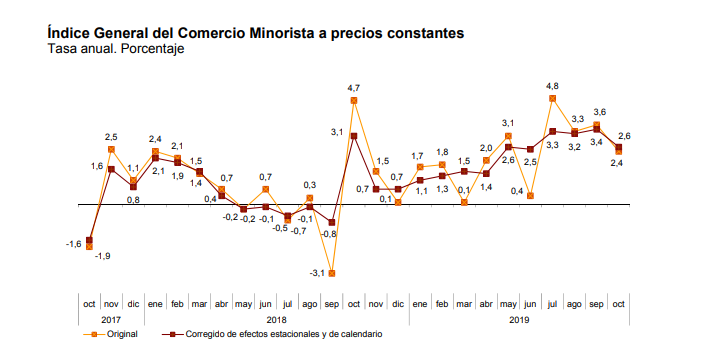 El Índice de Comercio al por Menor (ICM), la serie original del ICM a precios constantes registró en octubre una variación interanual de las ventas del 2,4% respecto a octubre de 2018, lo que supone ocho décimas por debajo de la tasa del mes anterior.